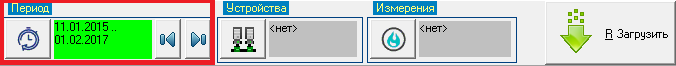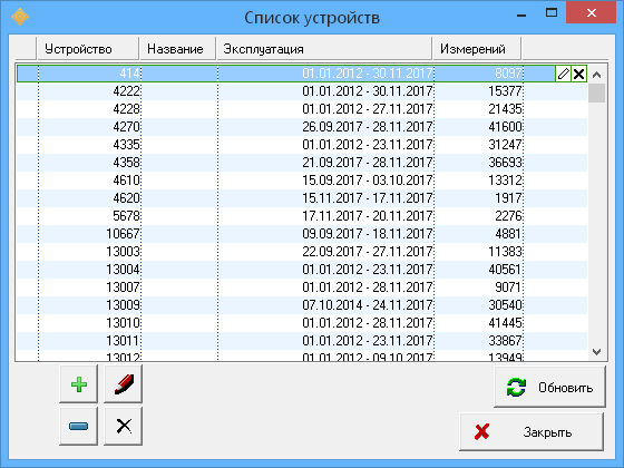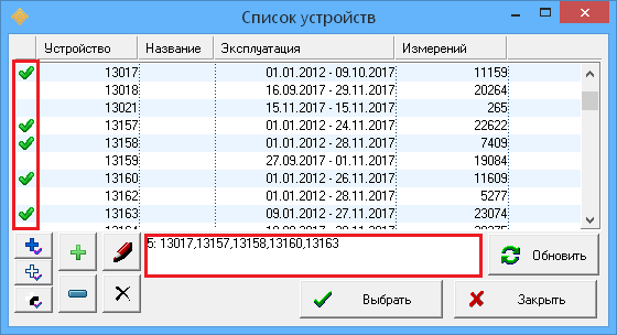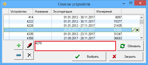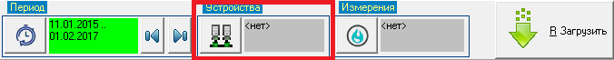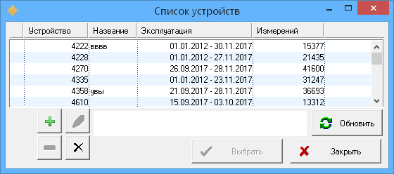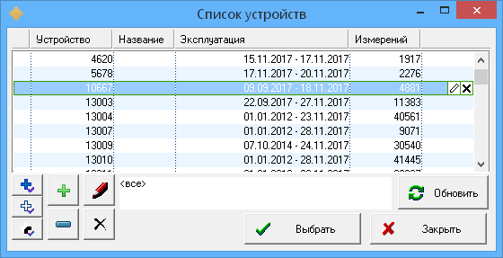 Кнопка Устройства выводит на экран список доступных устройств, для которых имеются записи данных.